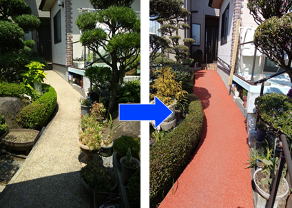 ゴムチップ舗装 →公共の公園、ランニングコース、幼稚園など広く使用されている。住宅にも使用できる。