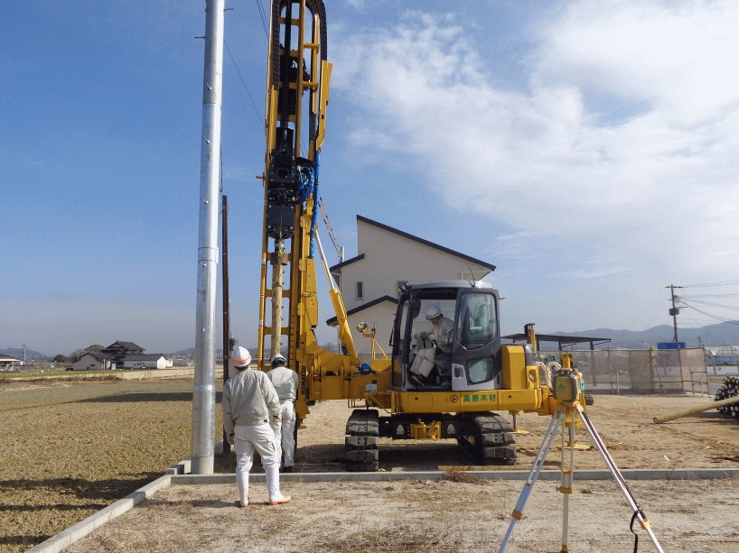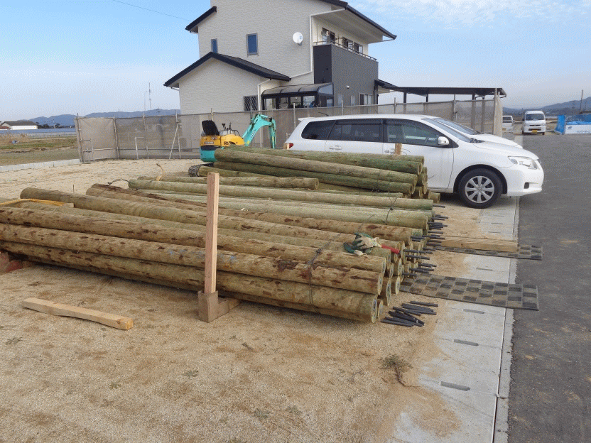 地盤補強に杉の杭材料使用、